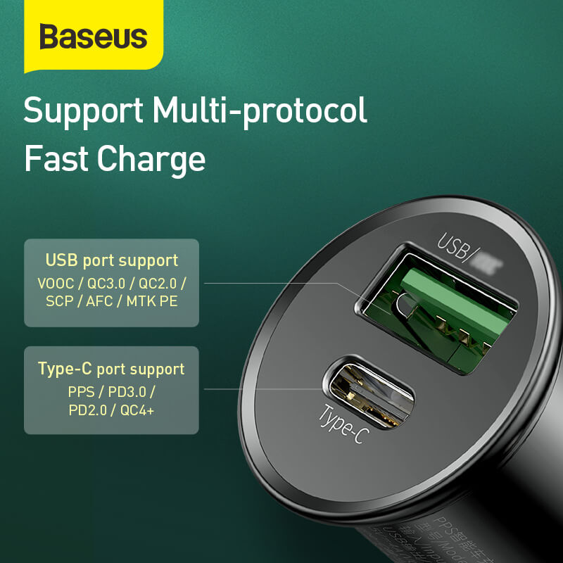 The Baseus Circular Metal PPS Quick Charger Car Charger 30W is made from high-quality aluminum alloy, this car charger is not only durable but also adds a touch of sophistication to your car's interior. With its advanced technology and multiple charging ports, it ensures that your devices are charged quickly and safely.